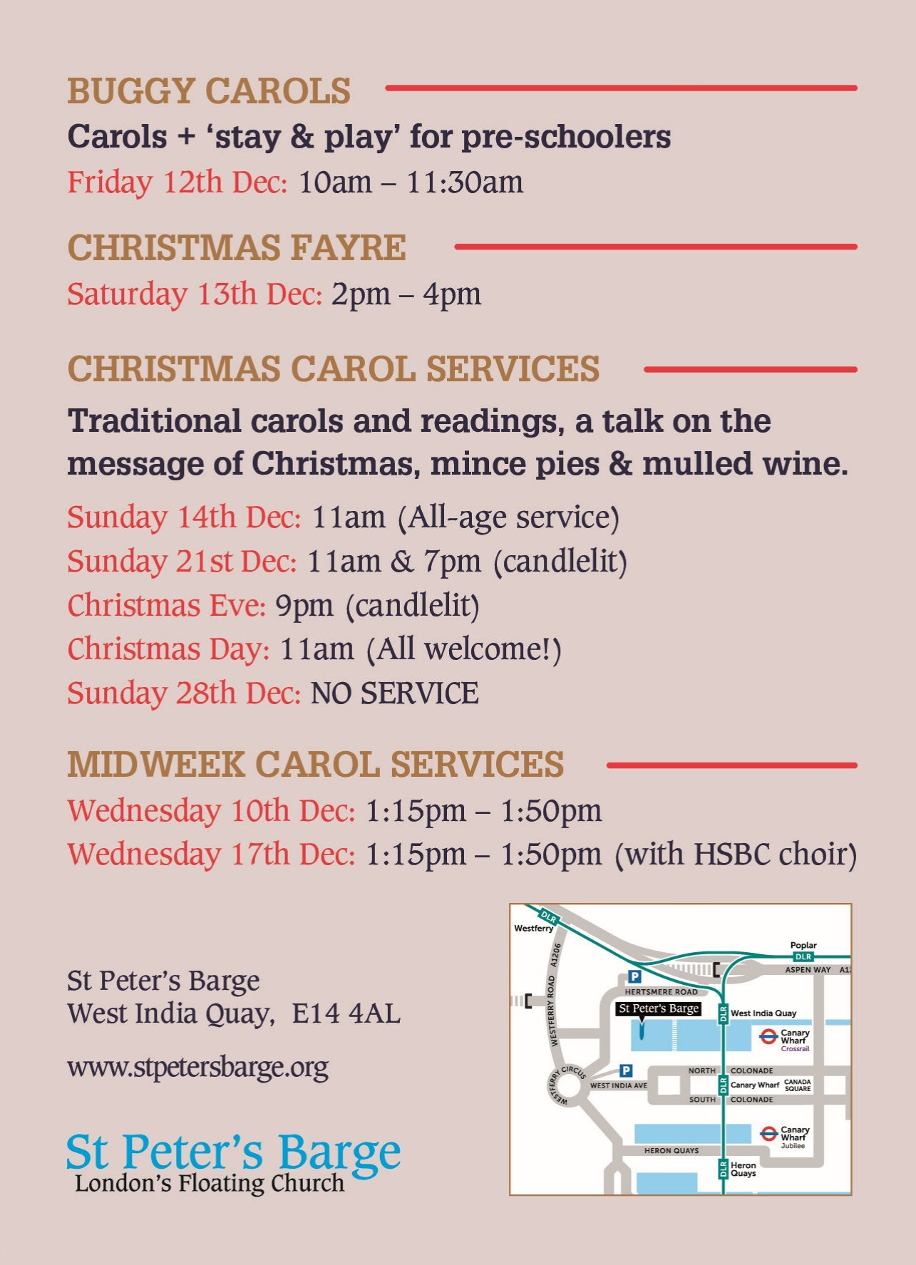 Christmas on the Barge All are welcome to join us this Christmas. At each service we sing carols, listen to Bible readings and a talk on the meaning of Christmas, and enjoy mulled wine and mince pies. The event flyer can be downloaded here.